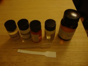 My apartment has become a perfumery. I just finished my concoctions. I now have four vials of what hopefully will be nice-smelling perfume. I think they have to “sit” for a day or something. This is what I received in my kit: