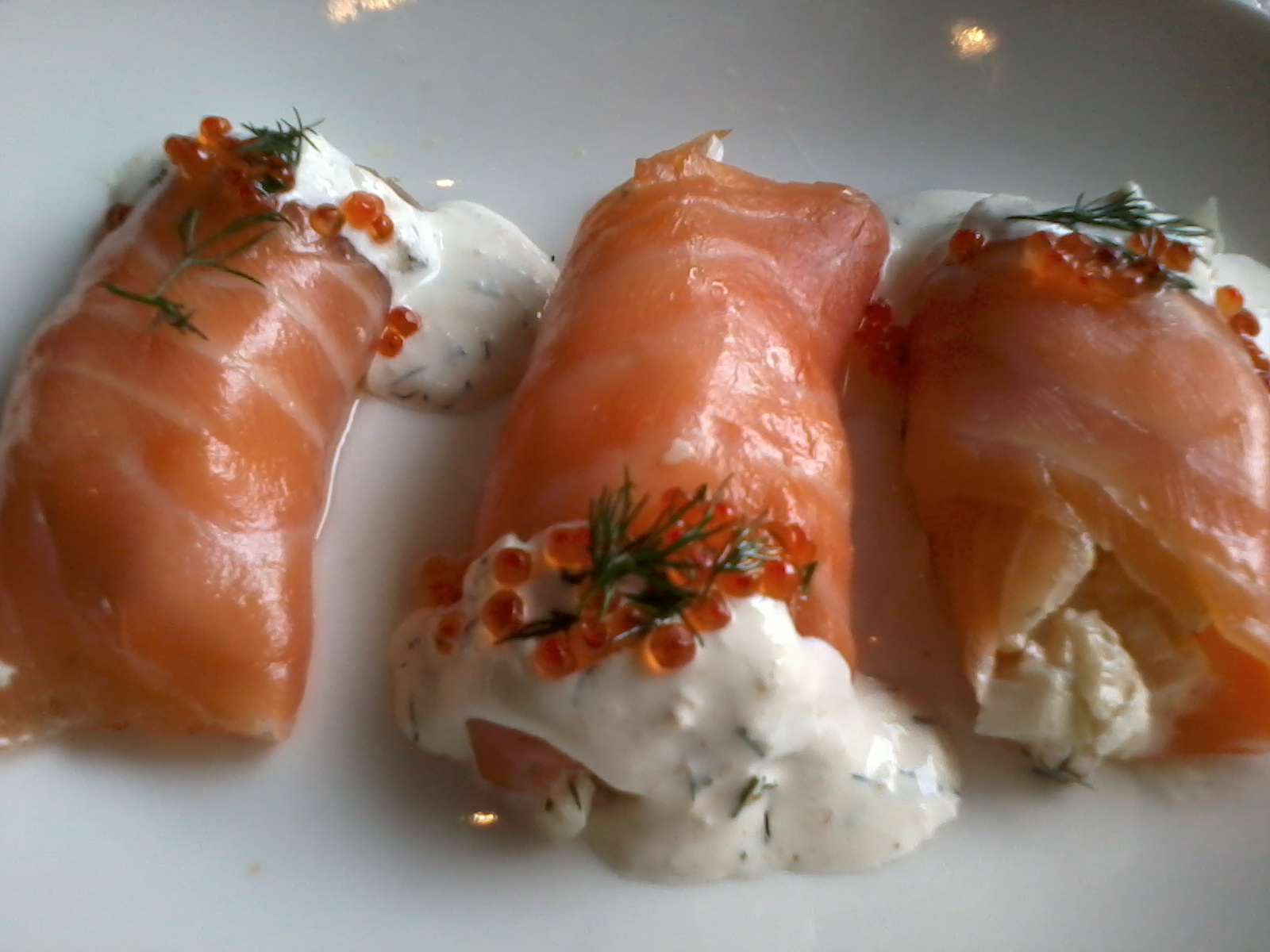 The first course was OK…a lot of raw salmon, which I am not used to. A bunch of onion and other crunchy veggies were smothered in a dill sauce and wrapped in the salmon.