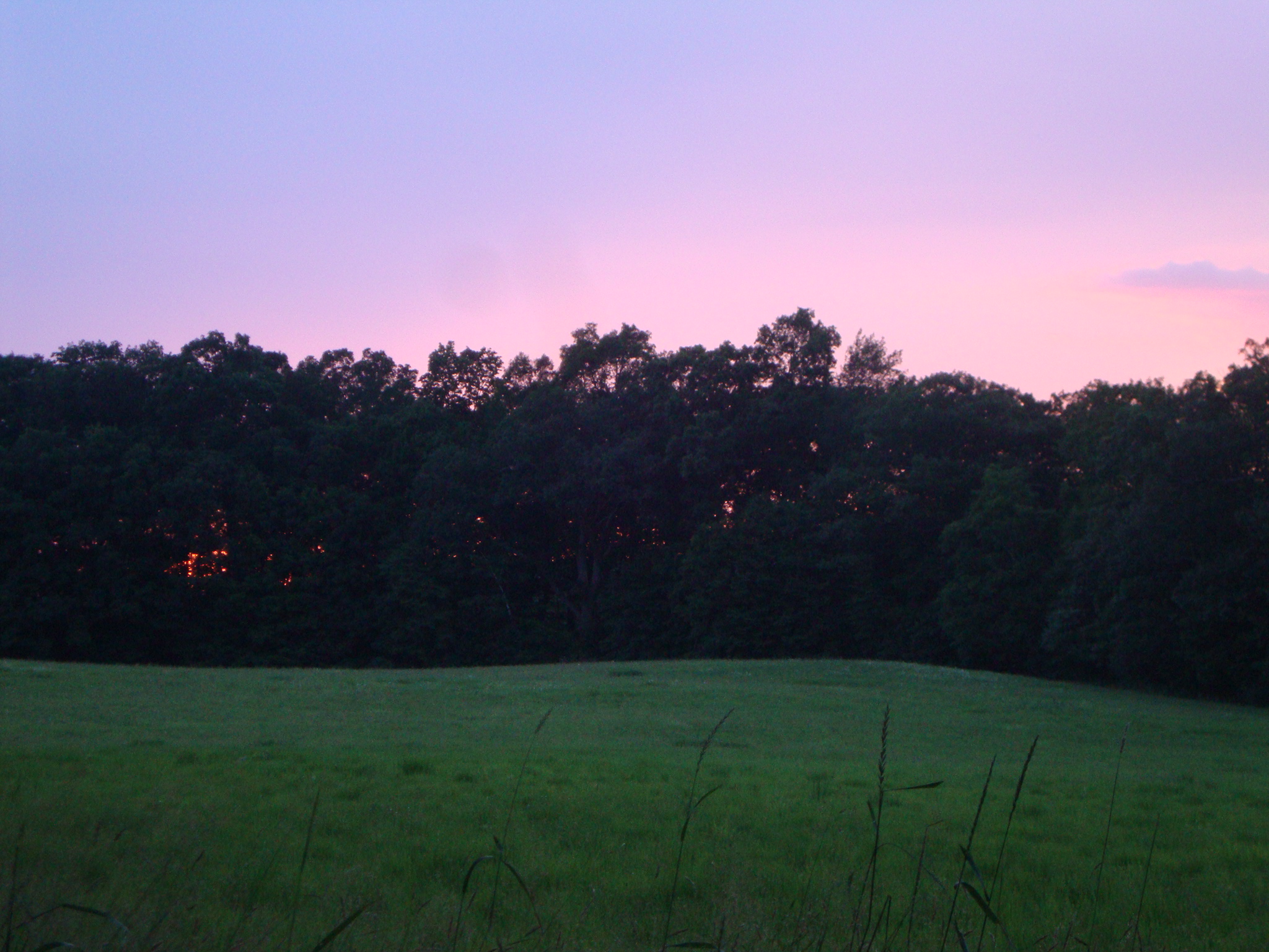 The last night of my stay, I sat on a rock wall in front of a huge open field, reading a book as the sun set through a tall bank of trees.
