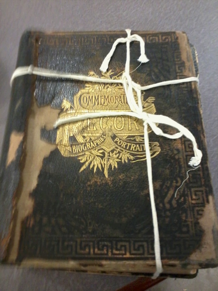 I looked at the big boy, titled Commemorative biographical record of central Pennsylvania : including the counties of Centre, Clearfield, Jefferson and Clarion / containing biographical sketches of prominent and representative citizens, and of many of the early settled families. The black leather cover was very ornate. As I gingerly untied the string and opened the cover, tiny pieces of leather and paper flitted onto my shirt and the floor. I looked around the room guiltily, but no other researchers were paying attention to me.