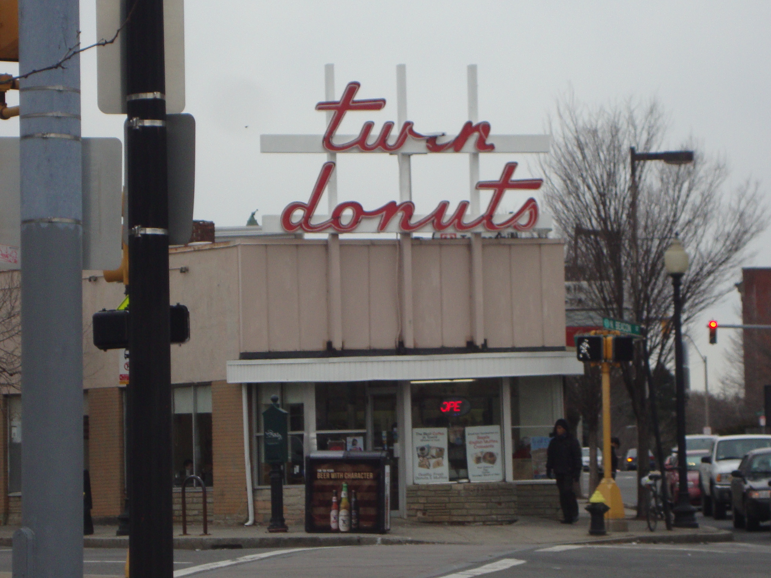 This morning, I made a donut pilgrimage. I have ridden by Twin Donuts at least 100 times on the bus, and have always been intrigued by its vintage signage: