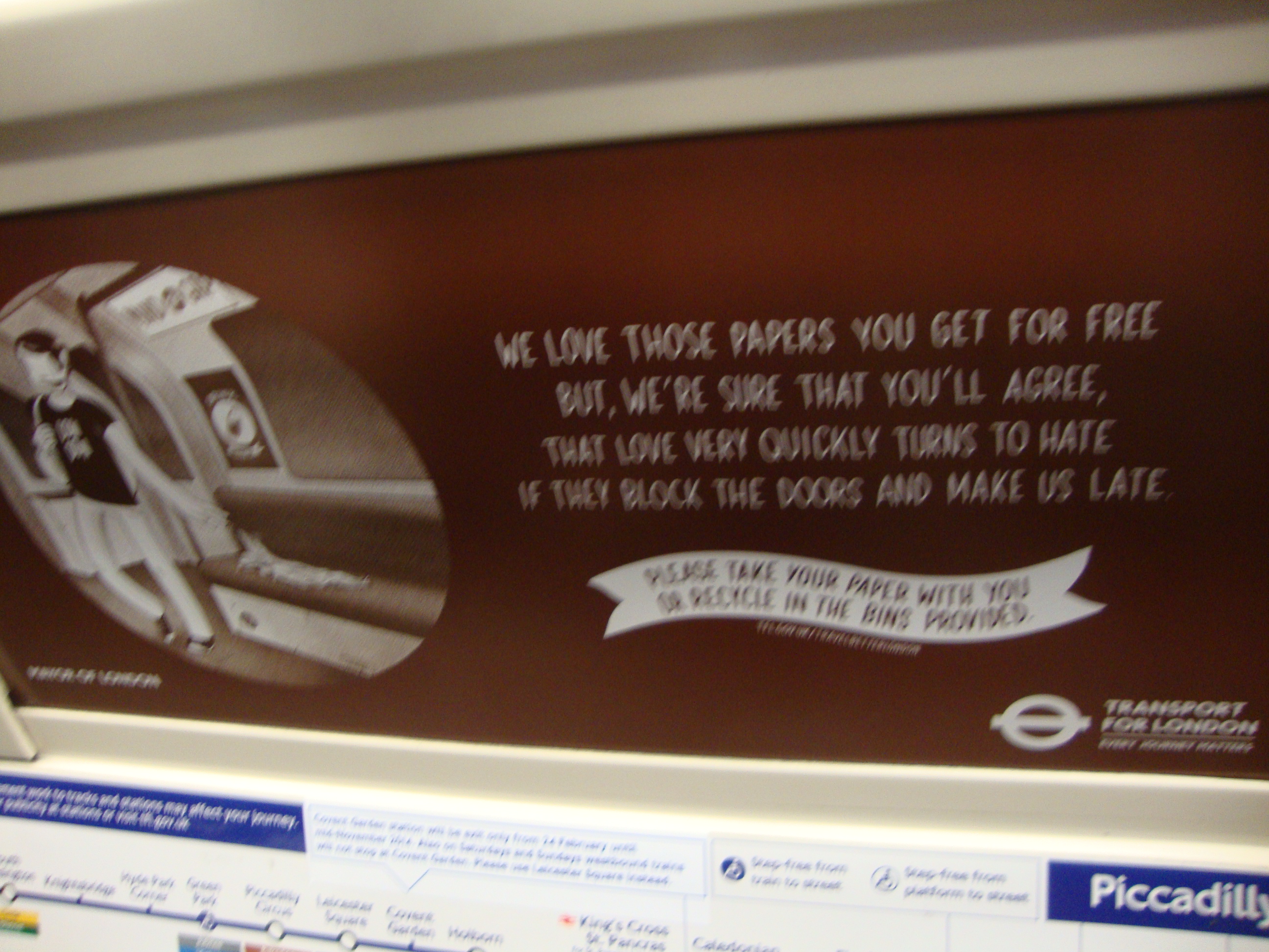 London has at least eight major newspapers. So many people read newspapers and leave them on the Tube that the Mayor of London’s office posted this ad on the Tube: