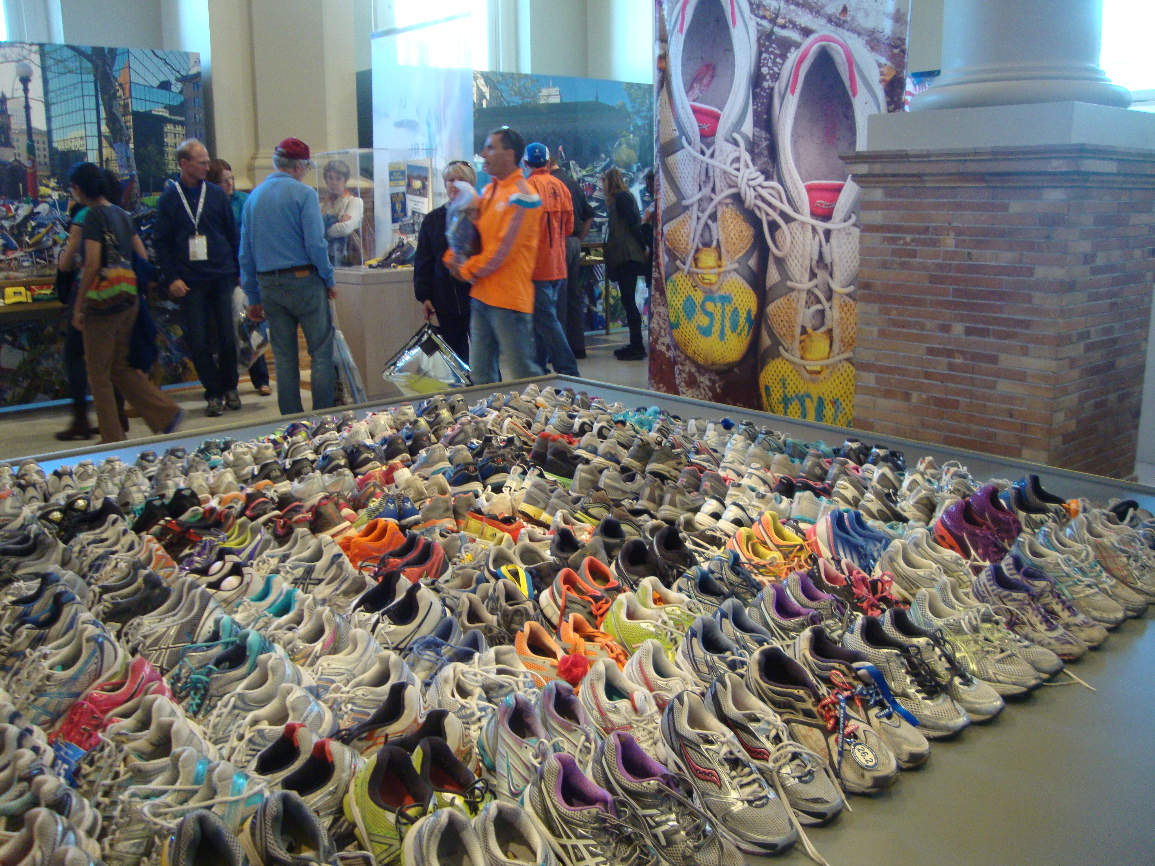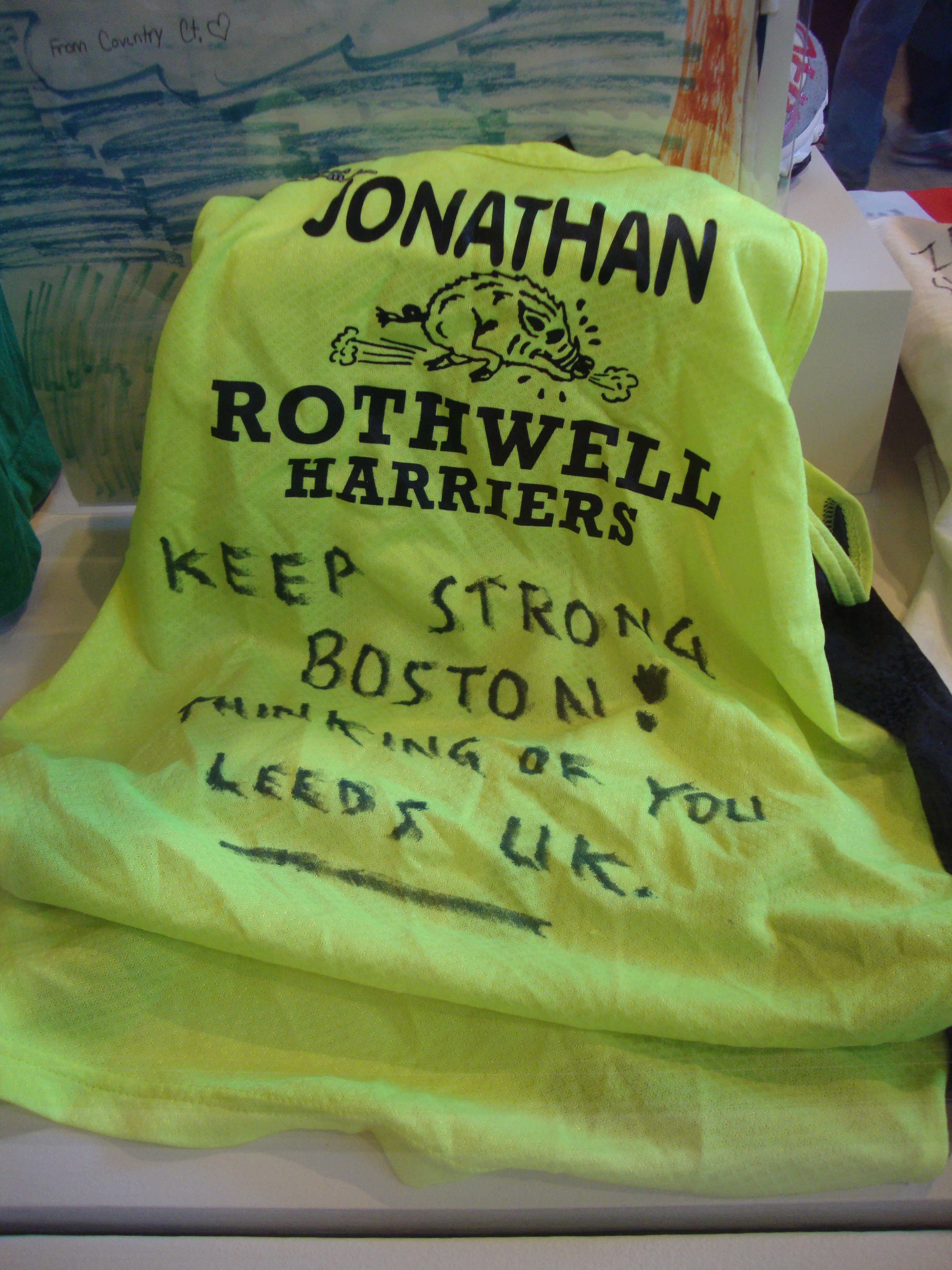A couple of days ago, Mary and I visited an exhibit of items left at the makeshift memorial in Copley Square after the bombings. As I’ve mentioned, I was sick during that time period, so I didn’t realize to what extent the world reached out to us in the aftermath until I walked through this exhibit. We made our way through the room, viewing the sneakers that runners left behind; the signed cards, posters, and T-shirts that people from around the world sent; the scraps of paper with kind messages scrawled on them. At the end of the exhibit, visitors were invited to sign a guestbook or write messages on tags and hang them on trees.