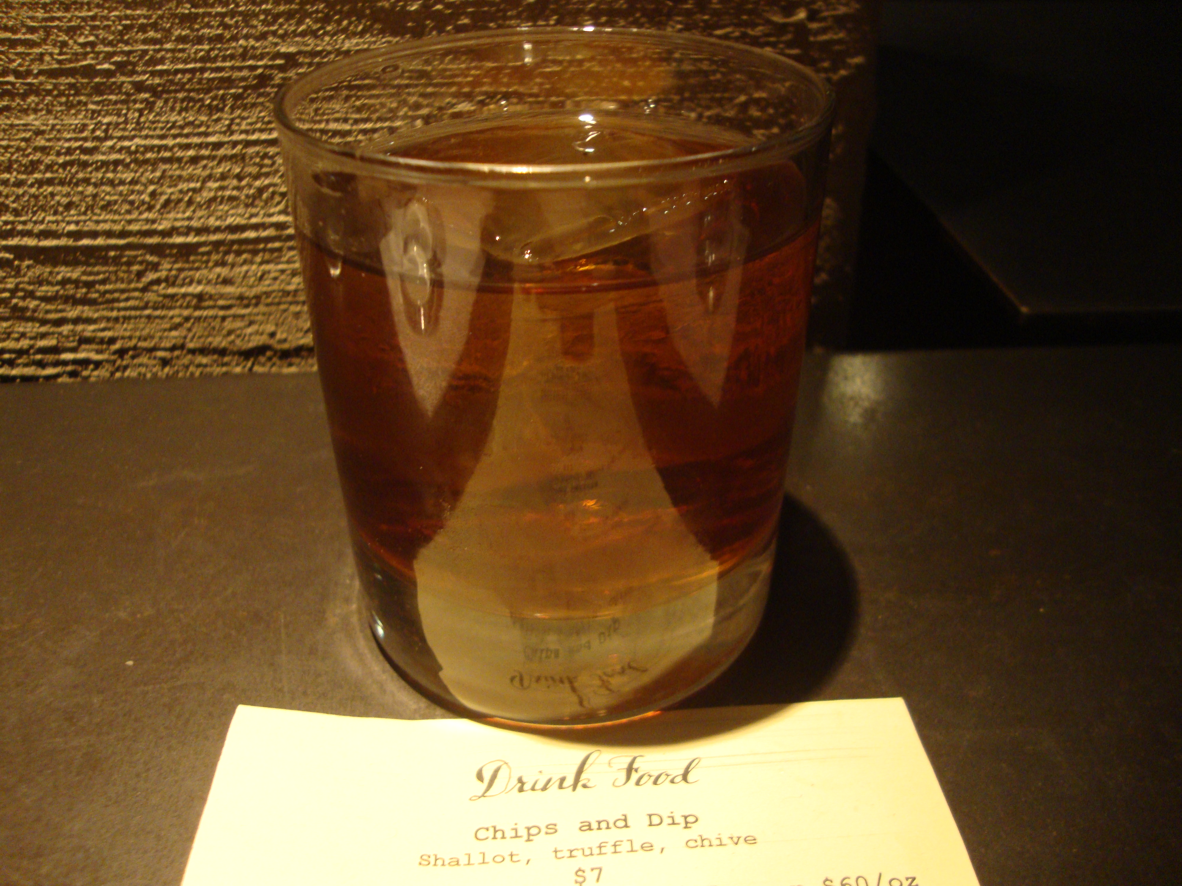 Drink is known for its cocktails. There is no cocktail menu; you tell the waiter/waitress what type of cocktail you like, and the bartenders come up with something. A friend had recommended a whiskey drink, so I tried that.