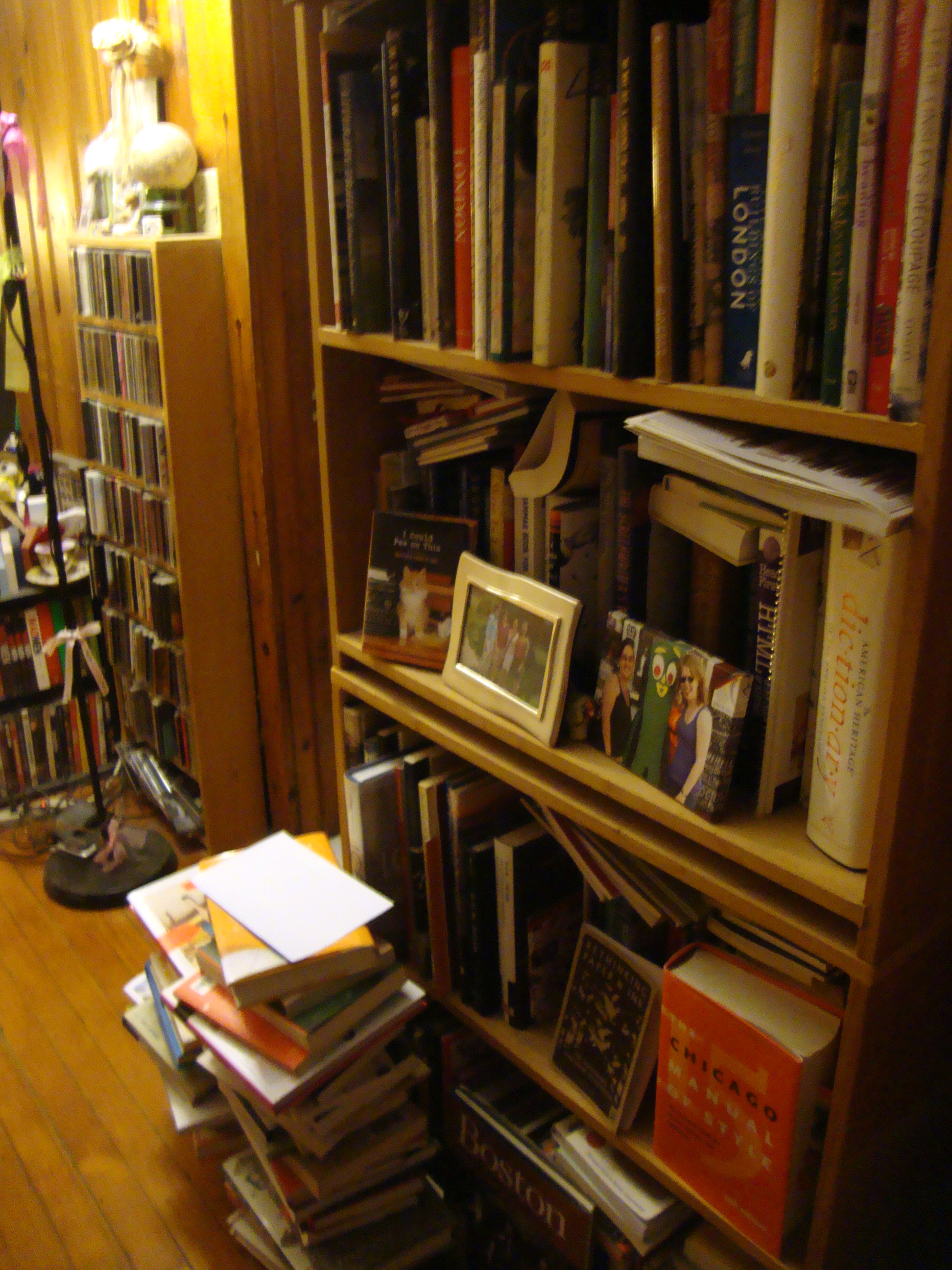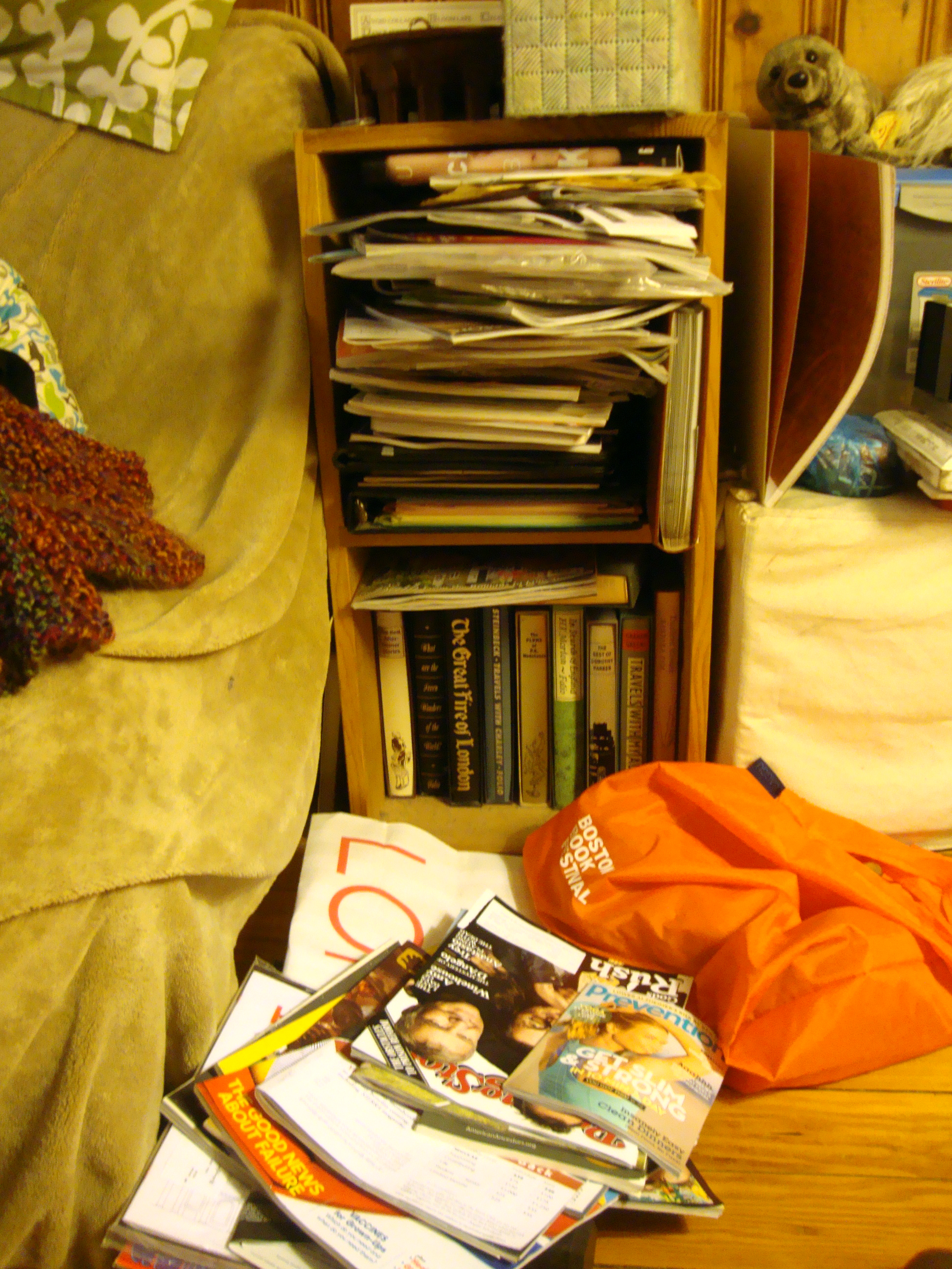 This is the current state of my main bookshelf and magazine shelf = overflowing. So I’ve decided to schedule an “adult story hour” a few times per week. I spend way too much time in front of a computer.