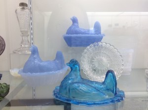 Plates, glasses, vases, salt cellars, chickens…all different colors and patterns.