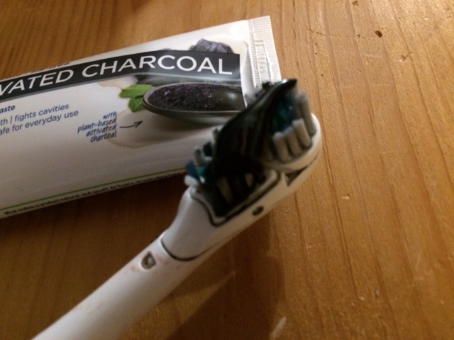 Tom’s charcoal toothpaste promises to gently whiten my teeth. Seems counterintuitive, but I’ll take a gamble. The toothpaste is as black as night. It tastes fine; I just have to get used to my whole mouth turning black as I brush.