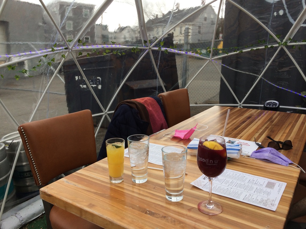 Allen and I splurged for our anniversary and had brunch in an igloo at a neighborhood restaurant called Article 24. We haven’t eaten at any restaurants in a while, so it was an odd yet familiar feeling. The igloo was heated and had a table set for six, so we had plenty of space.