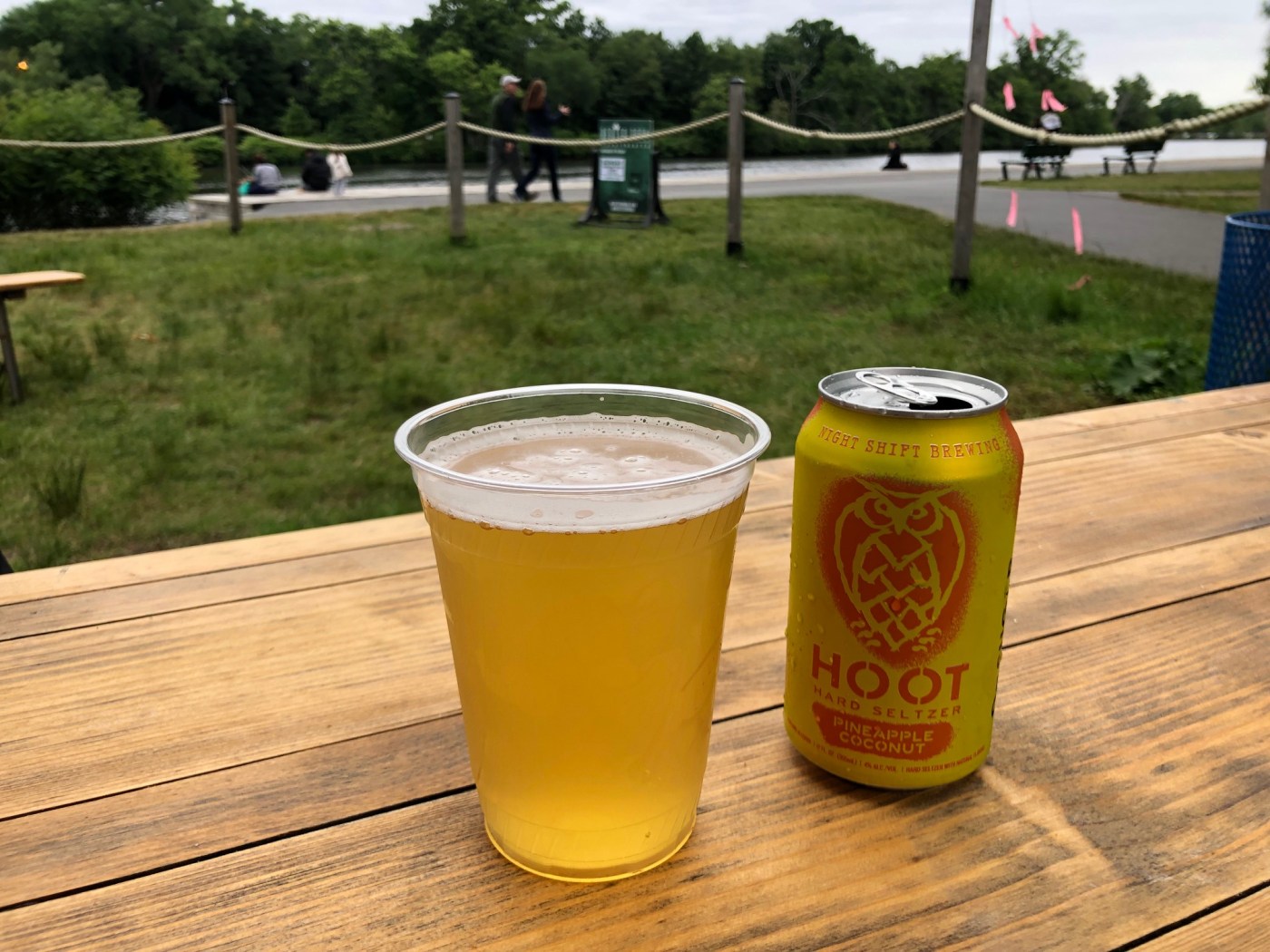 My favorite of the outings was the Night Shift Brewing popup in Christian Herter Park in Allston, only because we had a view of the Charles River from our seats. The tables were spread out from each other, so I also felt more comfortable there, COVID speaking. I actually didn’t have a beer that day; I tried a pineapple coconut hard seltzer. Allen had a farmhouse ale.