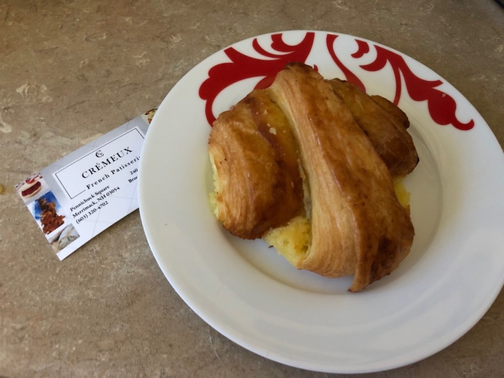 I visited a new place in my neighborhood for the croissant. It’s super-new, having just opened in the last month or so. It’s a French place called Cremeux that sells French pastries, sandwiches, coffee, and Belgian chocolate. I ran in to get something to go, and the almond croissant called to me.
