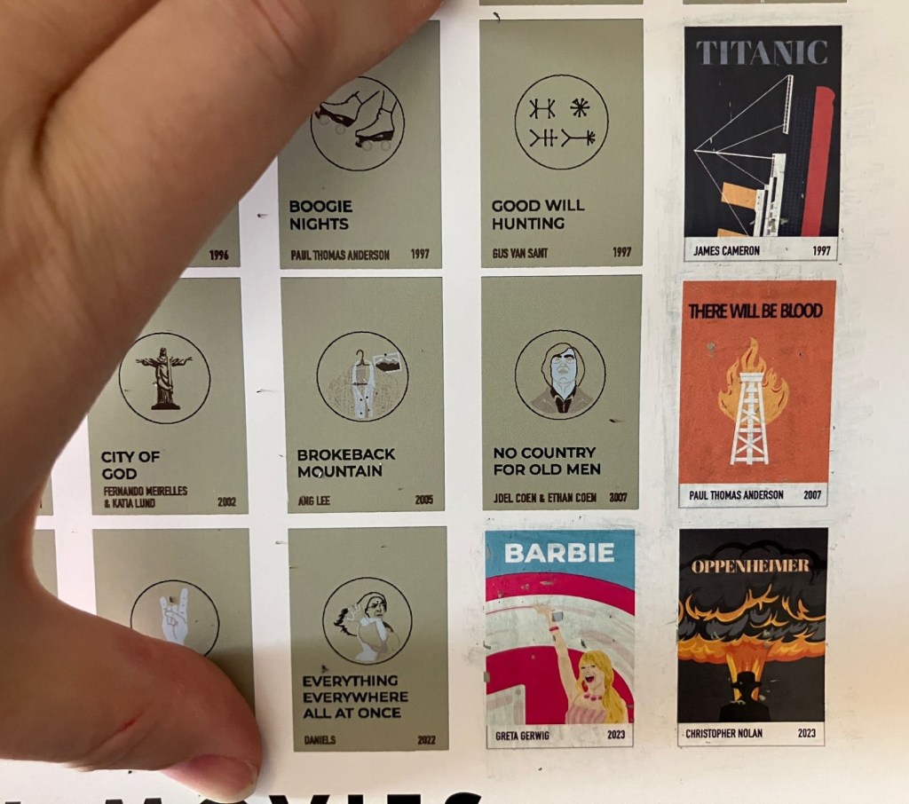 I bought a unique gift for myself recently—a Pop Chart scratch-off poster. I chose “100 Essential Movies” because I have watched AFI’s Top 100 movies for my birthday list. So I thought I would have most of the items covered. I haven’t looked at every single square yet, but I will have at least a few new movies to watch. I’ve avoided No Country for Old Men because I can’t stomach much violence. But it’s on the poster, so here we are.